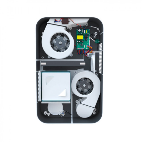 Приточный и вытяжной вентиляторы с 9 скоростными режимами обеспечивают эффективную циркуляцию воздуха в помещениях до 75 кв.м. Встроенный пластинчатый рекуператор подогревает приточный воздух зимой, снижая теплопотери и экономя энергию.